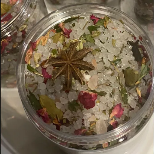 If you don’t have a bathtub, you can still enjoy the full cleansing benefits of this herbal bath salt. Simply dissolve the salt in a bucket of warm water and let it sit for 30 minutes to 1 hour so the herbs and flowers can fully activate. Use this water to wash your body slowly in the shower, allowing the aroma and steam to open your pores. Gently rub the herbs and salt water over your skin as a natural body scrub, letting the botanical blend cleanse, refresh, and energize you. You can also dissolve the salt in warm water and dip a towel to use as a warm compress all over your body. These methods provide the same powerful detoxifying and rejuvenating experience, even without a bathtub.